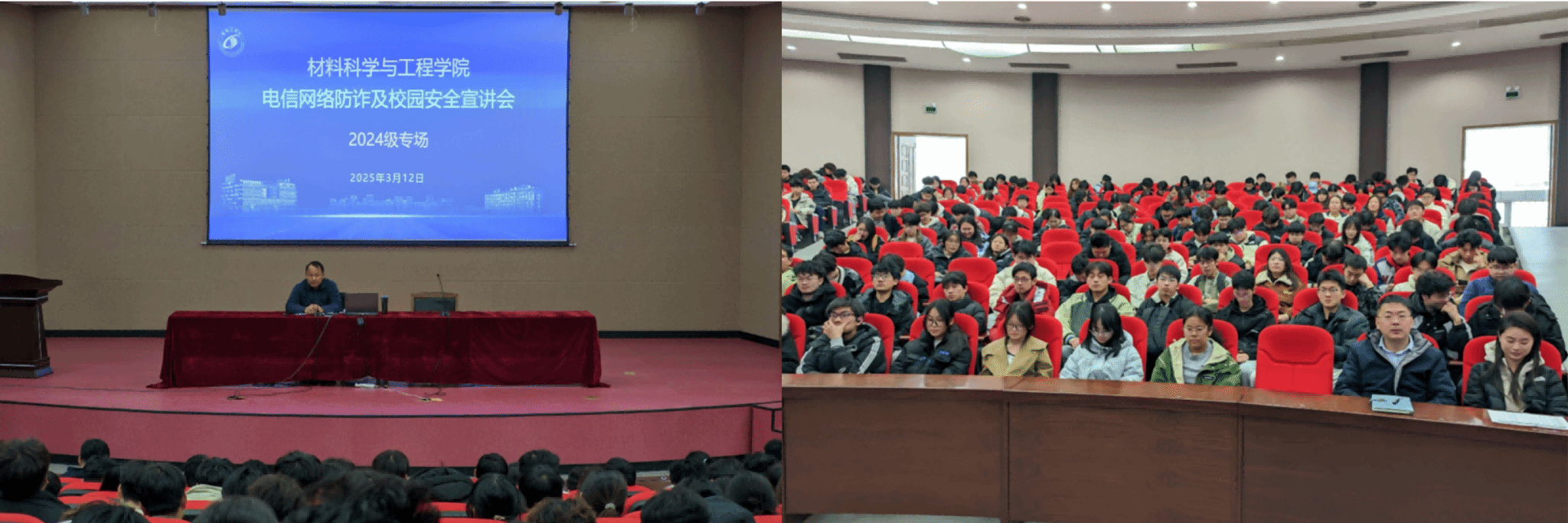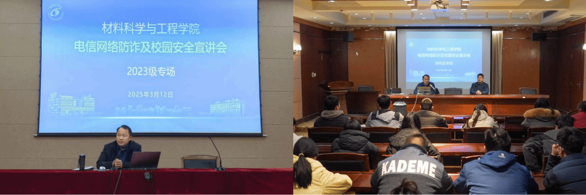 为切实增强大学生的防诈骗意识和能力,营造安全、和谐的校园环境,3月12日下午,材料学院在北校区重点实验室报告厅和五四报告厅分别为研究生和本科生们开展了“电信网络防诈及校园安全宣讲会”。学院副院长刘超、党委副书记温崇明、专职辅导员和全体学生参加本次宣讲会。