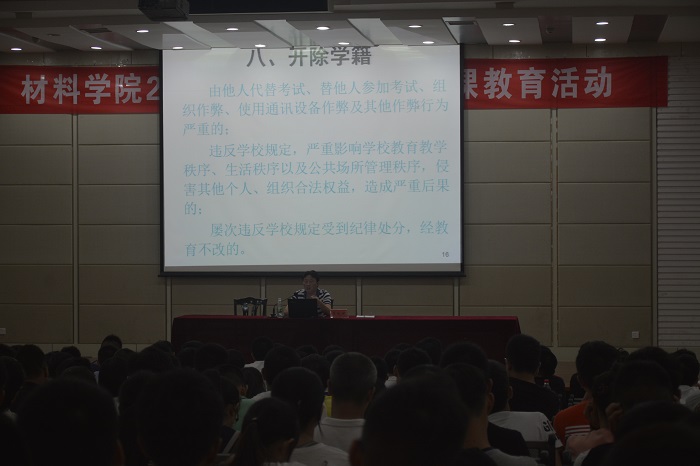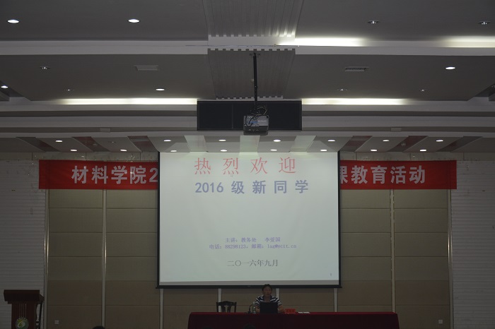 9月11日下午16点,材料学院在建军东路校区化工楼报告厅举办了2016级新生“大学第一课”系列教育活动之学籍管理教育讲座。讲座由教务处教务科李爱国科长主讲,由材料学院林玲科长主持。