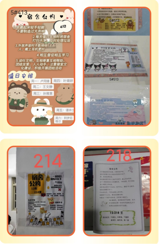通过设立宿舍公约,解决生活中的小问题,可以使宿舍更文明,校园更温馨,同时也可以提高寝室生活质量,增强宿舍幸福感和凝聚力,提高宿舍成员的自觉性和自律性。此次活动要求各寝室成员共同商定、共同创作,共同制定寝室行为规范与学习、生活目标,短短两天时间里,大家相互探讨、分工合作,寝室成员分工明确,各司其职,共同为宿舍荣誉出谋划策。本次活动采用线上评比的方式进行,经过激烈角逐,材料学院5#604,5#611,12#223,12#224四个宿舍脱颖而出,荣获本次评比活动的一等奖宿舍。5#413,5#513,9#305,9#405,12#214,12#218获得二等奖宿舍,5#501,5#506,5#517,9#403,9#404,12#217,12#222,12#312,12#313获得三等奖宿舍,其余参与宿舍均获得优秀宿舍称号。