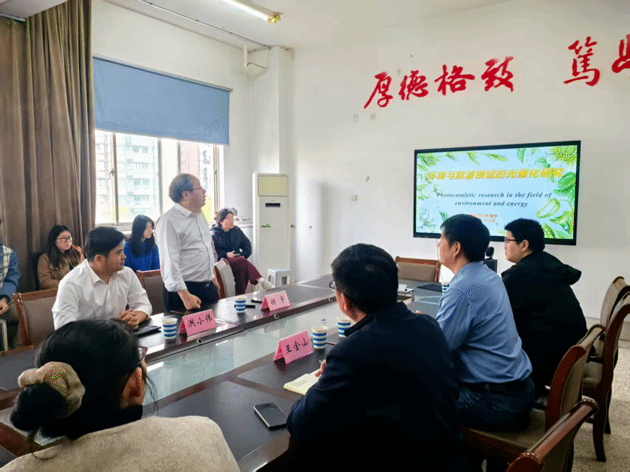 谢宇教授以《环境能源领域的光催化研究》为题,详细介绍了光催化研究背景、光催化在环境保护和新能源领域的应用、光催化降解研究、光催化产氢研究光催化二氧化碳还原研究等光催化领域的热点及关键科学问题。在交流环节中,谢宇教授与参会师生在光催化材料的选择、光催化关键表征技术等问题上展开了深入的交流和讨论。学术报告会由刘超主持。