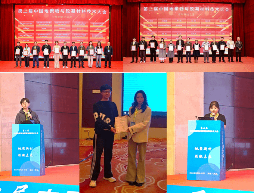 大会对获得优秀表彰的个人、企业和团队进行了表彰。材料学院罗驹华教授团队-固废利用资源化团队被评为“合作创新团队”,王苗苗博士被评为“青年科技之星”。朱哲誉博士做了题为“氨基酸对线性硅烷改性水化硅酸钙微纳结构的影响” 的报告;材料科学与工程专业的硕士生陈浩然和叶婧妍、交通运输工程专业的周怡君分别做了题为 “水化环境对氟石膏胶凝材料反应过程的影响”、“磷酸镁胶凝材料防腐蚀涂层及防护机理研究” 、“水滑石基光催化水泥材料制备及降解性能研究”的报告。