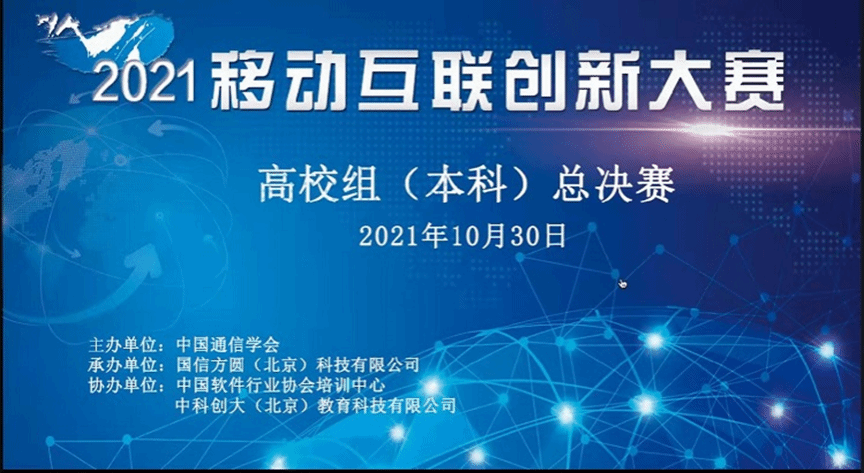 10月30日-31日,2021(第七届)年全国移动互联创新大赛总决赛在钉钉线上举行。经过线上演讲、ppt展示、评委提问等环节,经钟栋青、韦凌翔、杜建周老师指导,我院胡化鹏、胡莹莹、陈慧娴、赵洪旭、孔龙龙、杨锦诚等同学完成的作品《基于视频数据的路侧不规范停车识别系统》获得三等奖。