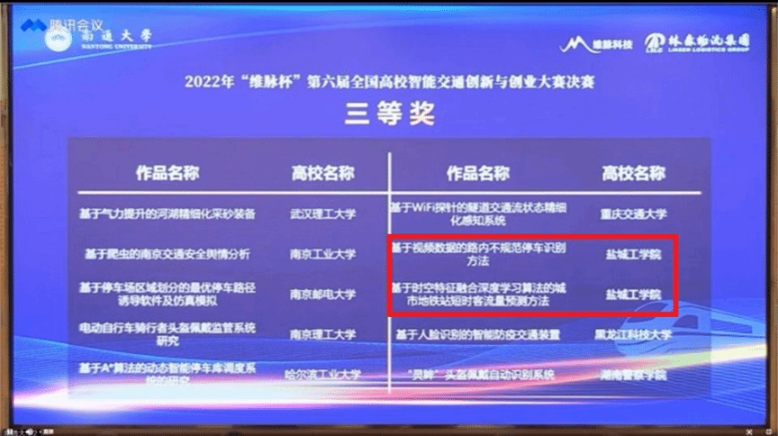 73日,“维脉杯”第六届全国高校智能交通创新与创业大赛决赛在南通大学落下帷幕,本次比赛采用线上方式进行。经过线上演讲、实物展示、评委提问等环节,材料学院学生2项作品获三等奖,分别是交通工程专业胡莹莹、杨锦诚、宋亚静、李丽莎、刘浩宇五位同学完成的作品《基于时空特征融合深度学习算法的城市地铁站短时客流量预测方法》(指导老师:钟栋青、韦凌翔)和胡化鹏、姬玉川、徐晶楠、陈天昊、刘义伟五位同学完成的作品《基于视频数据的路内不规范停车识别方法》(指导老师:韦凌翔、钟栋青)。
