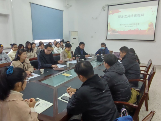 11月11日下午,在北校区知达楼第一会议室,材料学院召开预备党员转正答辩大会。校关工委常务副主任施鲁莎、学院党委副书记朱凌以及学生党支部书记担当评委,5名拟转正预备党员参加。