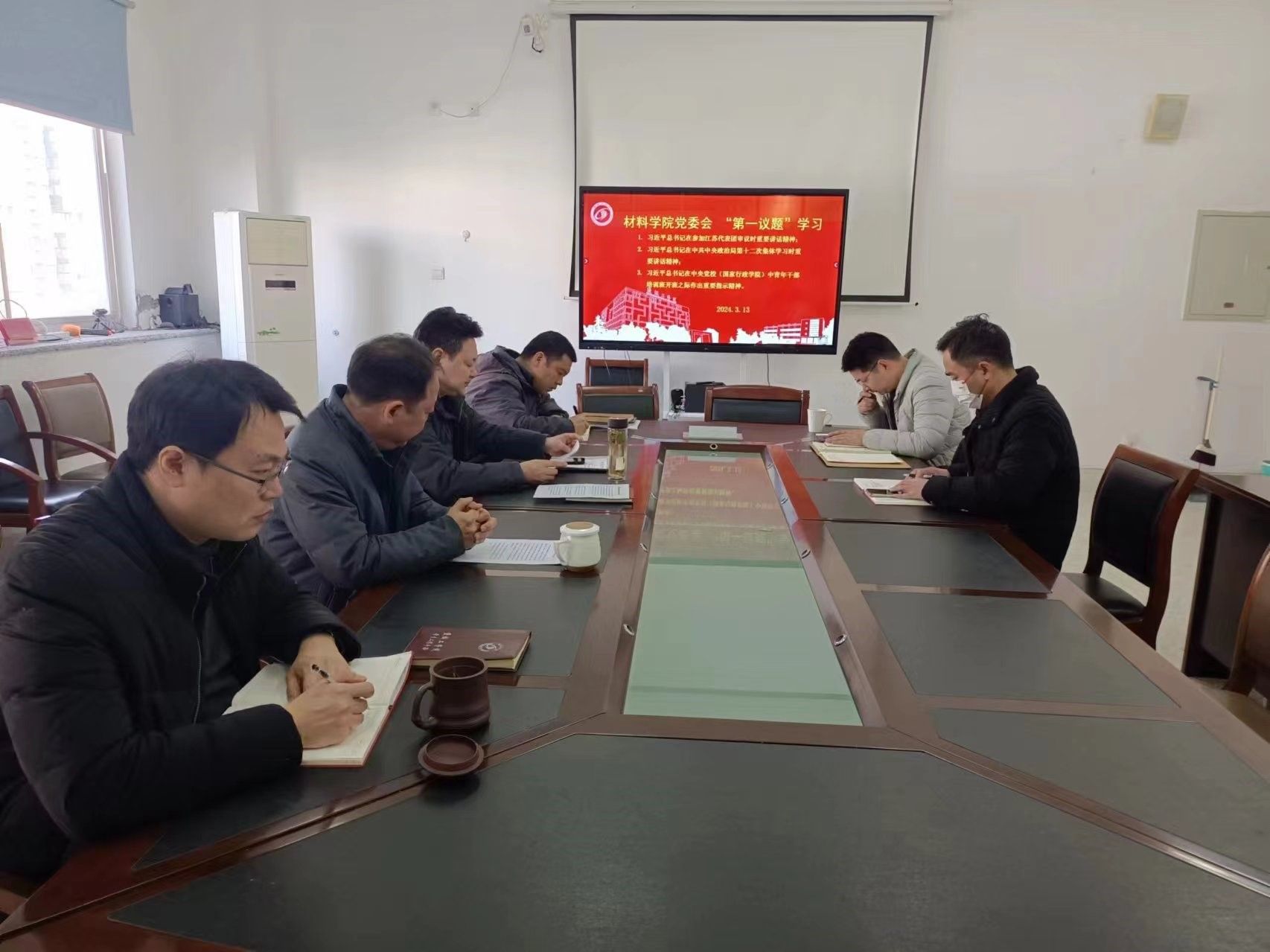 3月13日上午,在知达楼B314会议室,材料学院党委会以“第一议题”形式,认真学习习近平总书记在参加江苏代表团审议时、在中共中央政治局第十二次集体学习时、在中央党校(国家行政学院)中青年干部培训班开班之际作的重要讲话重要指示精神。学院党委书记唐浩主持会议,全体党委委员参加。