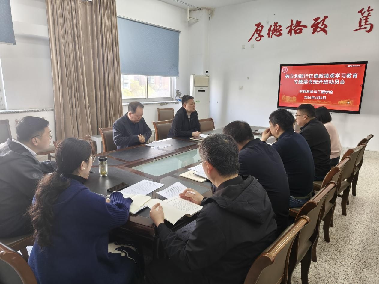 4月8日上午,材料学院在学院第一会议室举办树立和践行正确政绩观学习教育专题读书班动员会。学院领导班子成员、党政办主任及各党支部书记参加会议,会议由学院党委副书记温崇明主持。