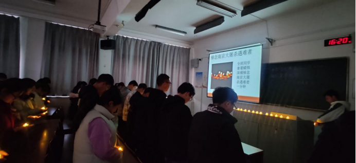 活动首先由班长带领全班同学观看PPT,由南京大屠杀中留存的图片引进主题。今年的12月13日,是我国第六个法定的南京大屠杀死难者国家公祭日,82年前的12月13日,侵华日军攻占南京,制造了惨绝人寰的南京大屠杀惨案,30万同胞惨遭杀戮。图片中,日军将失去战斗力之中国军人反绑双臂、集体杀戮后掷入水池中。池水被鲜血染红,此池中遗体达300余具。南京大屠杀幸存者是那场惨案的见证者,每一位南京大屠杀的幸存者,都是这段历史的活证人。看完ppt后,我们全体成员手持小烛灯默哀三分钟。今日之祭奠,不只是民族的悲怆,还有历史的训诫,告诉每一个中华儿女国耻在心、重任在肩。当谨记:吾辈当自强、勿忘国耻!在活动结束后,全体同学抒发感想,手拿团旗拍照留念。