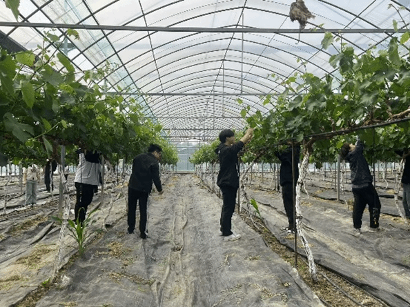 随后,学生们两人一组,在立体栽培架间穿行,为葡萄藤“理发”。随着时间的推移,起初笨拙的操作逐渐变得流畅。抬头掐须的酸痛、指尖沾染的汁水、身上出的汗水,成为最生动的“劳动教材”。将“汗滴禾下土”的诗句从课本铅字中唤醒,镌刻为青春的独家记忆。