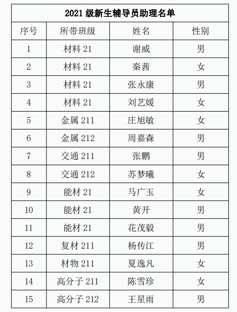 根据《材料科学与工程学院关于公开竞选2021级辅导员助理的通知》相关要求,经学生自愿报名、学院审核、面试选拔等环节,拟确定谢威等15名同学为2021级新生辅导员助理推荐人选,如对评定结果有异议,五日内以书面形式向学院党委反映。