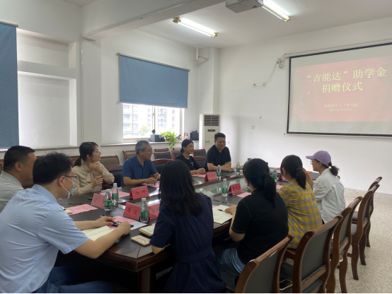 9月4日上午,在北校区知达楼第一会议室,材料学院举行“吉能达”助学金捐赠仪式。江苏吉能达环境能源科技有限公司总经理曹海宁、总经理助理徐玮,校党委宣传部部长、材料学院院长奚新国、党委书记唐浩、副院长诸华军、党委副书记朱凌以及学工办相关同志参加。