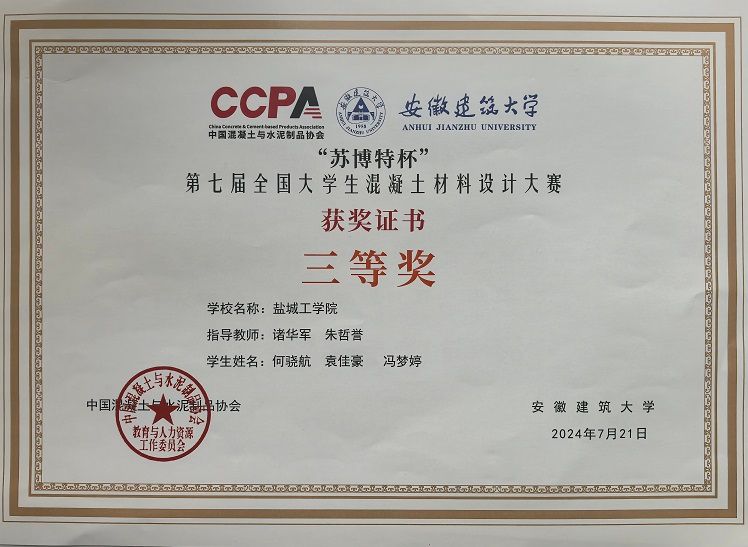 该项赛事包括理论考试、配合比设计、混凝土实操制备等多个环节,经过激烈角逐,由诸华军、朱哲誉两位老师指导材料学院学生何骁航、袁佳豪和冯梦婷组成的真材实料获得三等奖,杨涛、高璇两位老师指导材料学院学生纪盼、陈江辉和张青组成的砼心聚力获得绿色创意奖。