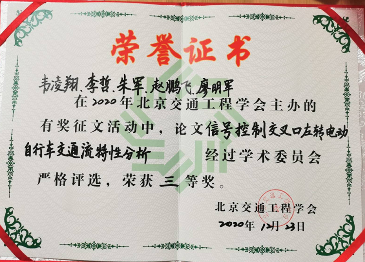 12月23日,北京交通工程学会举办主题为“智慧交通、品质出行、活力城市”的有奖征文线上颁奖活动。我院学生李哲、朱军在韦凌翔、廖明军两位老师指导下完成的作品《信号控制交叉口左转电动自行车交通流特性分析》获得三等奖。