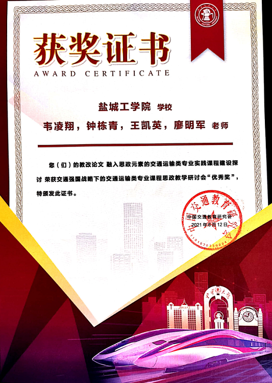 近日,材料学院教师收到交通强国战略下交通运输类专业课程思政教学研讨会获奖证书。经专家评审,材料学院交通工程系韦凌翔、钟栋青、王凯英、廖明军老师提交的教改论文《融入思政元素的交通运输类专业实践课程建设探讨》获得优秀奖。