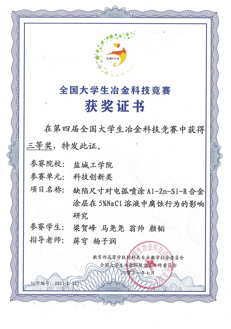 近日,第四届全国大学生冶金科技竞赛结果公布,我院杨子润、蒋穹、张柳等老师指导,梁贺峰、马尧尧、翁帅、颜韬等同学完成的作品《缺陷尺寸对电弧喷涂Al-Zn-Si-R合金在5%NaCl溶液中腐蚀行为的影响研究》、陈贺、杨文倩、王佳洁、齐向阳等同学完成的作品《粉末冶金法同步制备钢构件Mo2FeB2基硬质合金涂层的研究》均获得科技创新类三等奖,张威、张莹莹、顾文浩、李嘉豪等同学完成的作品《高性能层状B4C/Al复合材料制备》获科技创新类优胜奖。
