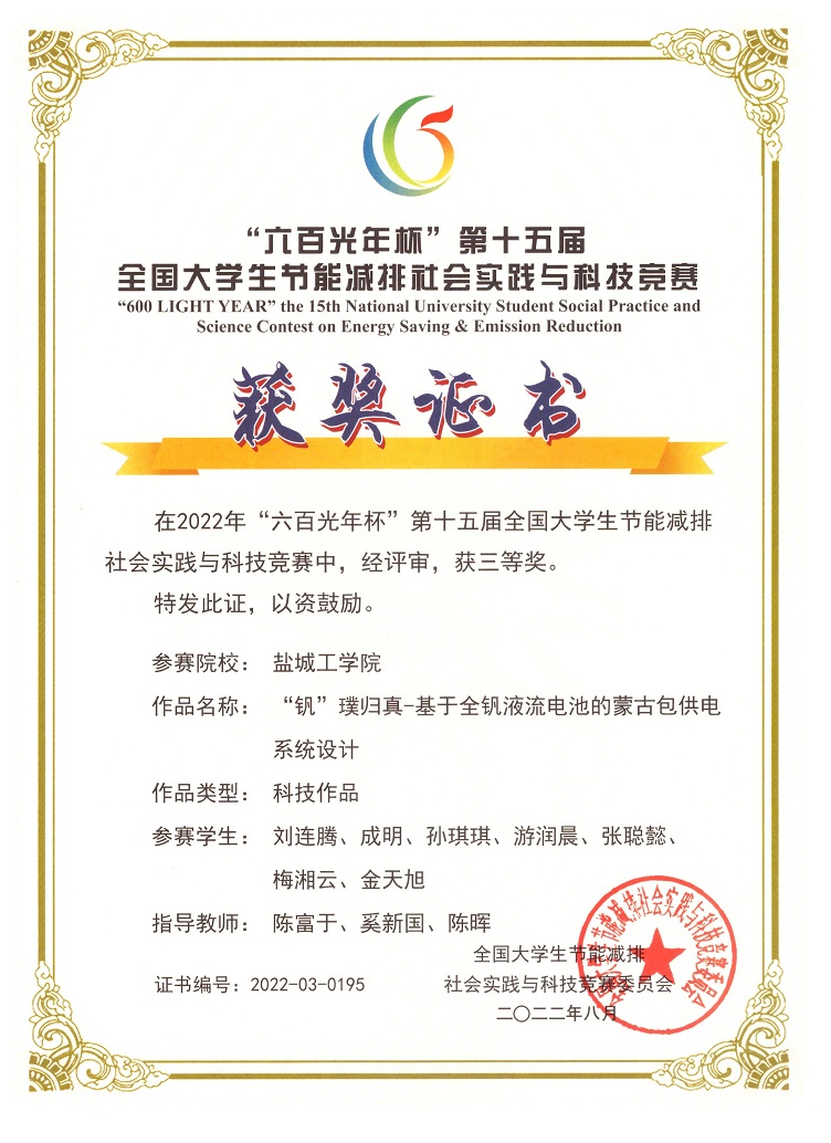 近日,第十五届全国大学生节能减排社会实践与科技竞赛结果公布,我院刘连腾、成明、孙琪琪、游润晨、张聪懿、梅湘云、金天旭等学生的参赛作品《“钒”璞归真-基于全钒液流电池的蒙古包供电系统设计》(指导教师:陈富于、奚新国、陈晖)荣获三等奖。