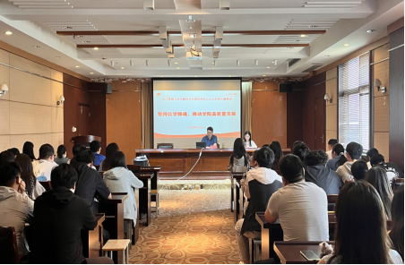 6月6日,在北校区行远楼重点实验室报告厅,我院学生第一、第二党支部开展“坚持以学铸魂,推动学院高质量发展”主题教育党课。学院党委书记唐浩主讲,全体学生党员参与。
