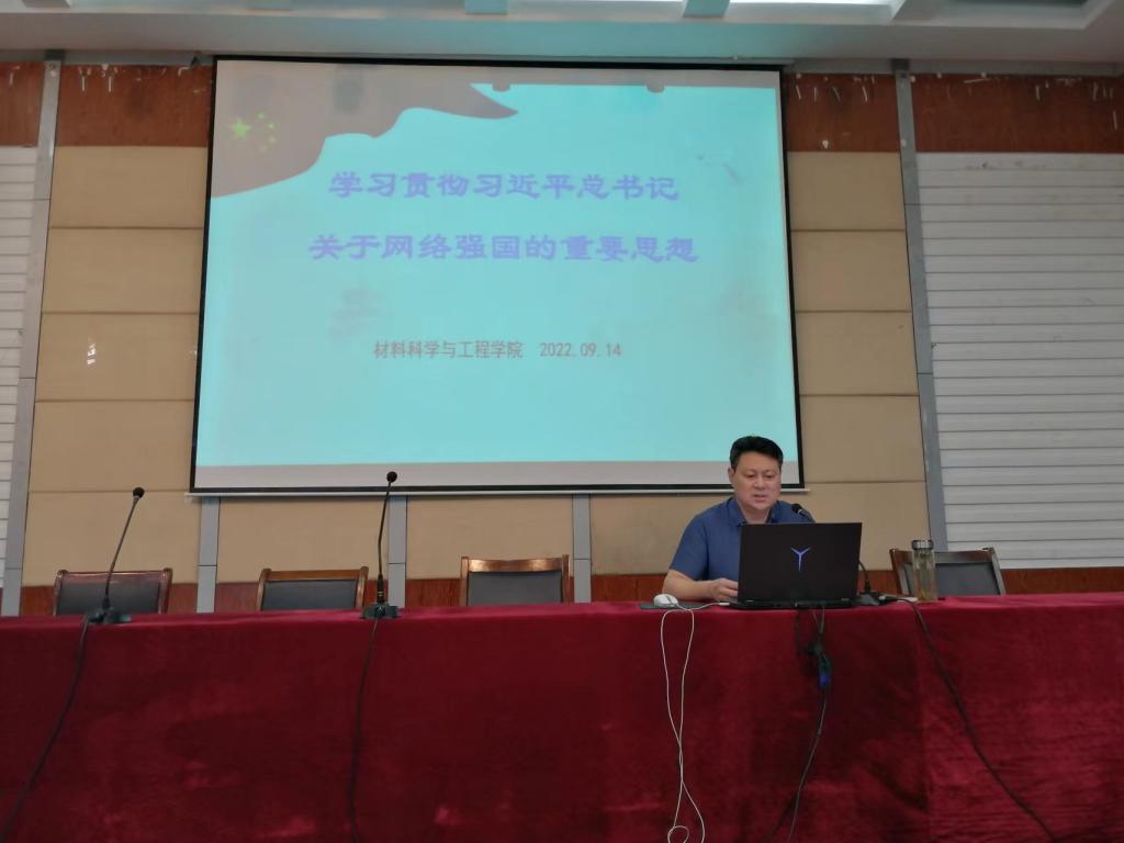9月14日下午,材料学院开展全体教职工政治理论学习,深入学习贯彻习近平总书记关于网络强国的重要思想,紧紧围绕迎接党的二十大胜利召开这条主线开展宣传教育活动。校党委宣传部部长、材料学院院长奚新国参加学习,材料学院党委书记唐浩主持,全体教职工参加学习。