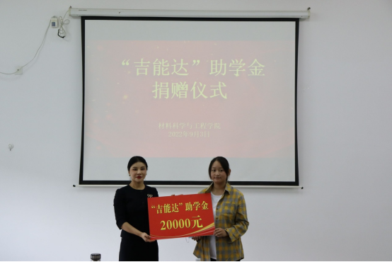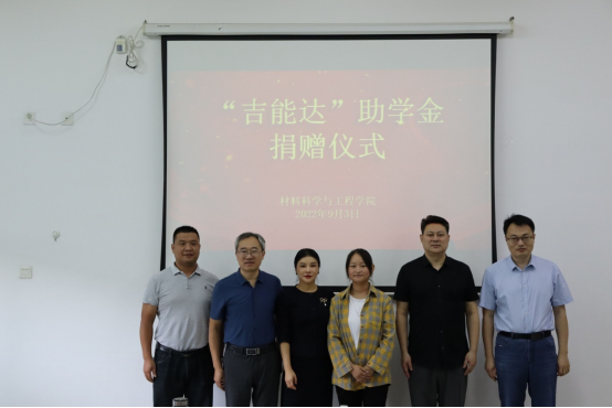 9月4日上午,在北校区知达楼第一会议室,材料学院举行“吉能达”助学金捐赠仪式。江苏吉能达环境能源科技有限公司总经理曹海宁、总经理助理徐玮,校党委宣传部部长、材料学院院长奚新国、党委书记唐浩、副院长诸华军、党委副书记朱凌以及学工办相关同志参加。