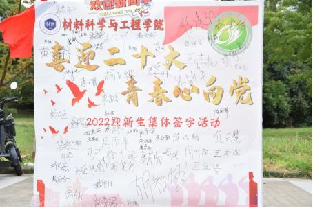 迎新现场摆放着介绍材料科学与工程学院最新资讯和相关活动照片的迎新展板,举办了“喜迎二十大,青春心向党”2022迎新生集体签名活动,新生们郑重的签下自己的名字,签下了“材子们”好好学习的决心。