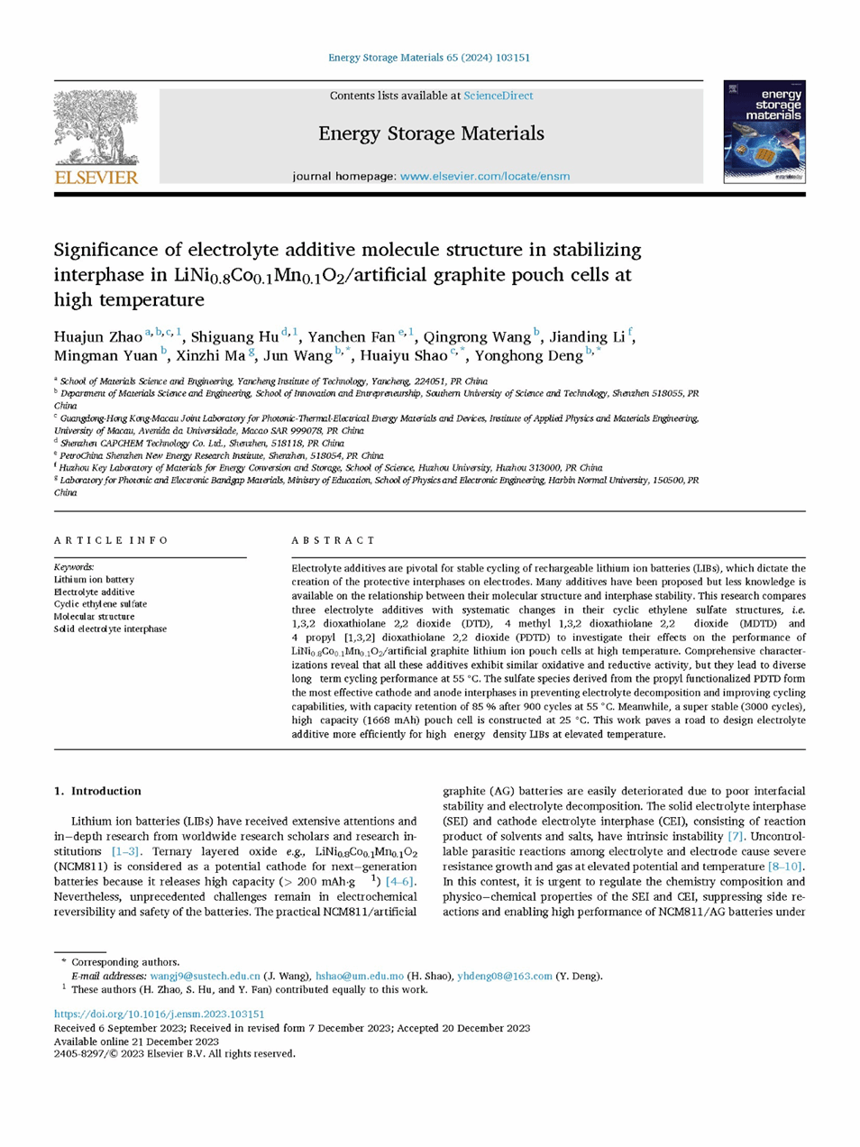 近日,我校材料学院赵华军博士在国际材料学科顶级期刊Energy Storage Materials上发表题为“Significance of Electrolyte Additive Molecule Structure in Stabilizing Interphase in LiNi0.8Co0.1Mn0.1O2/Artificial Graphite Pouch Cells at High Temperature”的研究成果,论文链接https://doi.org/10.1016/j.ensm.2023.103151。Energy Storage Materials发表储能材料等领域的重大新发现,涉及材料的合成、制备、结构、性能和技术应用,以及它们在电化学、化学、电学、热学、磁性和机械能存储装置中的应用,是国际公认的材料领域顶级专业期刊,在业界享有极高的声誉。最新影响因子为20.4。