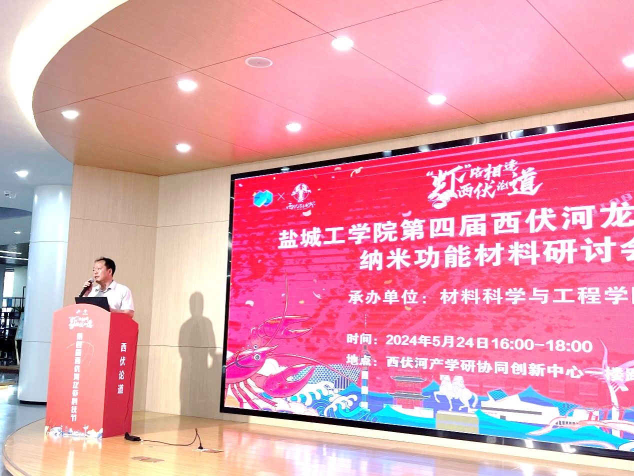 5月24日下午,材料科学与工程学院在西伏河产学研协同创新中心成功举办第四届西伏河龙虾科技节纳米功能材料研讨会。同济大学陆伟教授、南京理工大学杨毅教授、南京信息工程大学黄啸谷教授和南京理工大学谢阿明副教授应邀出席并作学术报告。盐城工学院副校长、盐城市政协副主席丁成莅临指导。材料学院党委书记唐浩、学院各研究所成员代表、专业系教师代表、研究生等50余人参加。材料学院院长罗驹华主持会议。