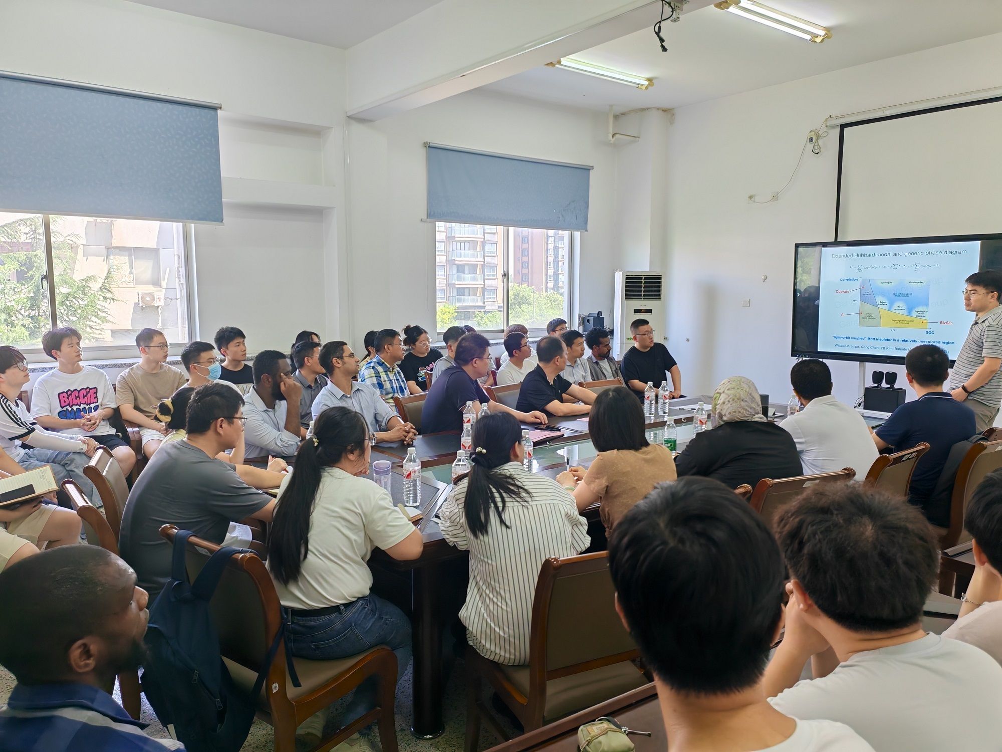 报告会上,陈钢教授以《Spin-orbit Coupling of the t2g Orbitals in Quantum Materials》为题,介绍了强弱关联物理的研究内容及应用,展示了由电子关联和自旋轨道耦合(SOC)共同作用引发的现象,以及4d和5d元素在重过渡金属化合物中的出射量子相和跃迁等研究成果。他认为,这是一个年轻、活跃、快速发展的领域,自旋-轨道耦合莫特绝缘体可能为实现各种新奇的量子相提供一个舞台。在交流环节中,陈钢教授与参会师生针对元素掺杂对结构、性能的影响及机理等问题展开了深入的交流和讨论。