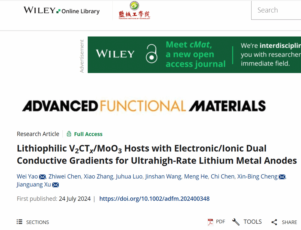 近日,我校材料科学与工程学院姚为教授在材料类国际顶级期刊《Advanced Functional Materials》(中科院一区Top,影响因子18.5)上以第一/通讯作者身份、盐城工学院为第一单位发表了题为“Lithiophilic V2CTx/MoO3 Hosts with Electronic/Ionic Dual Conductive Gradients for Ultrahigh-Rate Lithium Metal Anodes”的研究论文(Adv. Funct. Mater. 2024, 2400348)。该论文是我校在国际重要影响力期刊上发表高水平论文的又一次重大突破。