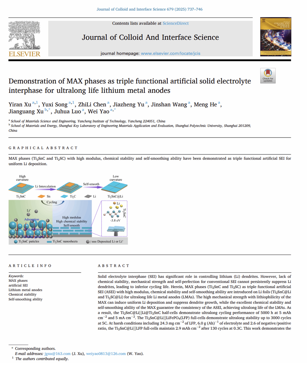 近日,材料学院研究生徐毅然在姚为教授的指导下,在《Journal of Colloid and Interface Science》(中科院一区Top,影响因子:9.4)上以第一作者身份,盐城工学院为第一单位发表了题为“Demonstration of MAX Phases as Triple Functional Artificial Solid Electrolyte Interphase for Ultralong Life Lithium Metal Anodes”的研究论文(J. Colloid Interf. Sci. 2025, 679, 737-746),文章链接:https://doi.org/10.1016/j.jcis.2024.10.019。该论文是我院研究生高质量培养的又一次重要体现。