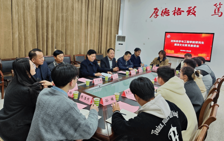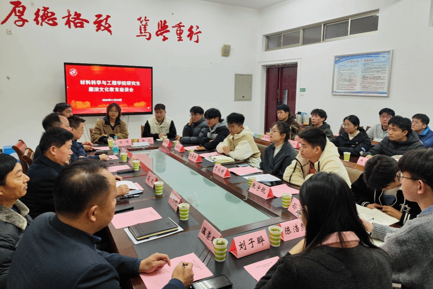 为推进校园廉洁文化建设,强化研究生的学术诚信意识,营造风清气正的学术环境,我院于11月23日下午15:00在材料学院第一会议室(知达楼B314)举行研究生廉洁文化教育座谈会。会议由材料学院院长罗驹华主持,副院长刘超、研究生辅导员及20余名研究生代表参加。盐城市文联原党组书记、主席高定,盐城市双泰热能设备科技有限公司董事长严书刚、上海良相智能化工程有限公司总经理陈波三位知名校友应邀出席。