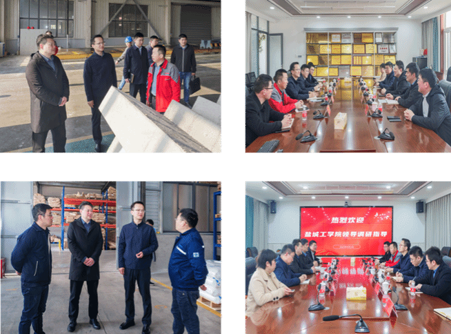 唐浩一行首站来到江苏博拓新型建筑材料股份有限公司、盐城健牌科技有限公司,参观了智能化生产线、数字化生产车间,听取了博拓建材、健牌科技近年发展情况以及产学研需求。双方表示将秉持“资源共享、优势互补、互利共赢”原则,精确对接企业需求,加强产学研深度合作以及人才培养方面的沟通交流,共同探索校企合作新模式。