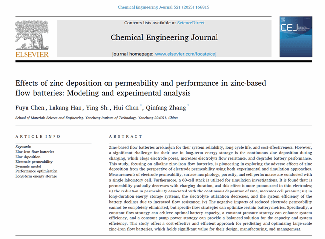 近日,材料学院陈富于博士的研究论文《Effects of zinc deposition on permeability and performance in zinc-based flow batteries: Modeling and experimental analysis》(Chem. Eng. J., 521(2025) 166815)发表于《Chemical Engineering Journal》( IF=13.2)。陈富于为第一作者,陈晖副教授和张勤芳教授为通讯作者,盐城工学院为唯一单位。