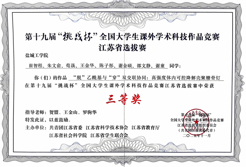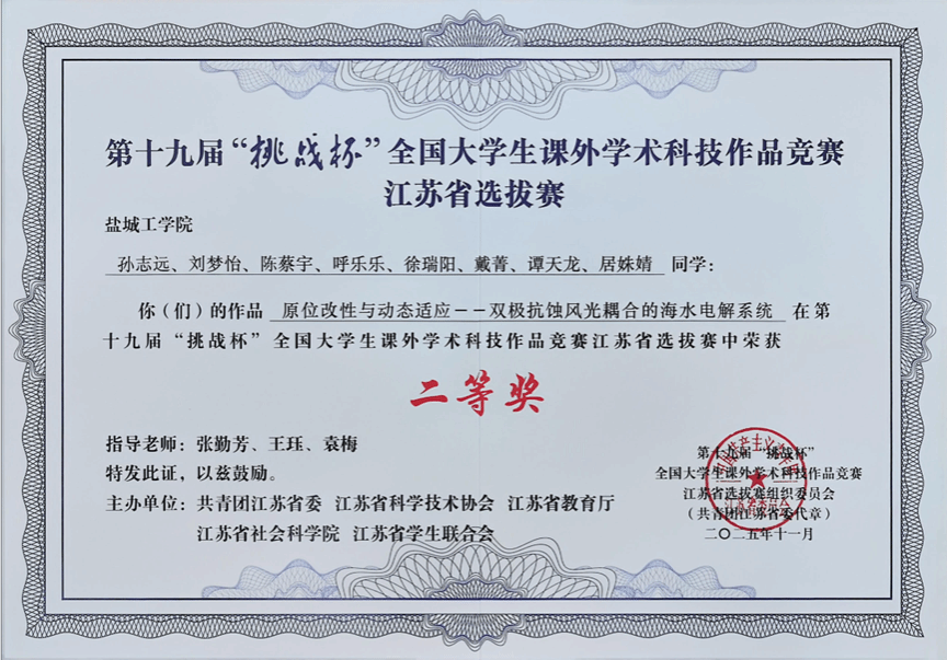 本次赛事由共青团江苏省委、江苏省科学技术协会等五家单位联合主办,全省共有3.6 万余个项目、30万余人次报名参赛。经校赛选拔推荐,共有802 个项目参与线下终审决赛,竞争尤为激烈。最终,孙志远、刘梦怡等同学的作品《原位改性与动态适应——双极抗蚀风光耦合的海水电解系统》,在张勤芳等老师指导下获二等奖。该作品聚焦新能源与海洋防腐领域,创新融合风光耦合与双极抗蚀技术,为海水电解高效稳定运行提供了新思路。崔智程、朱文俞等同学的作品《“脱”乙酰基与“穿”双交联协同:高强度体内可控降解壳聚糖骨钉》,在贺盟等老师的指导下获得三等奖。作品立足生物材料领域,通过协同改性技术优化壳聚糖性能,兼顾强度与可控降解性,为骨科医疗器材创新提供了新方向。