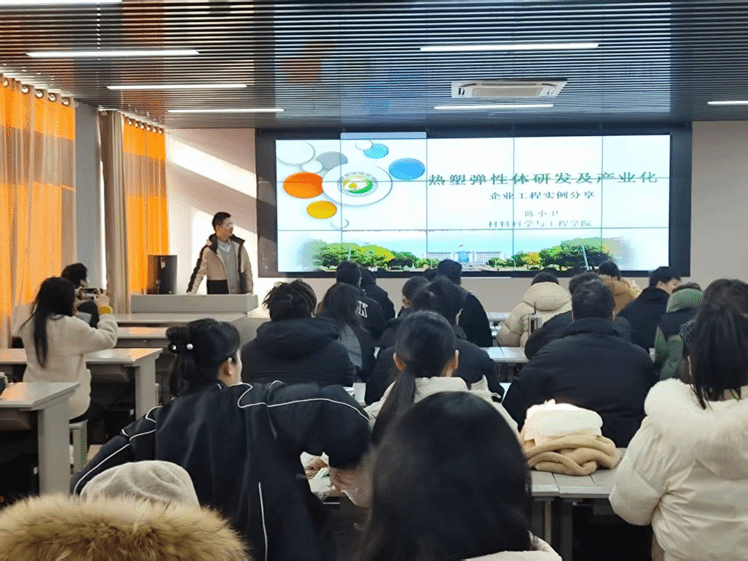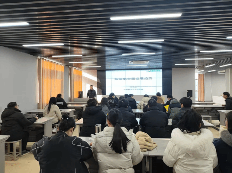 下午,何寿成面向本科生开展《陶瓷电容器发展趋势》报告,梳理MLCC技术演进脉络,指出其向“微型化、高容量”方向发展的趋势,围绕介电材料创新、制备工艺突破等前沿方向展开讲解,并结合中外企业案例,鼓励学生夯实基础、关注产业需求。陈小卫分享其在盐城市恒丰海绵有限公司实践经历,围绕“改性木质纤维素热塑弹性体”联合研发项目,介绍水性环氧树脂溶液改性木质纤维对聚氨酯弹性体性能的提升作用,目前该材料已完成初步研发进入小试阶段。