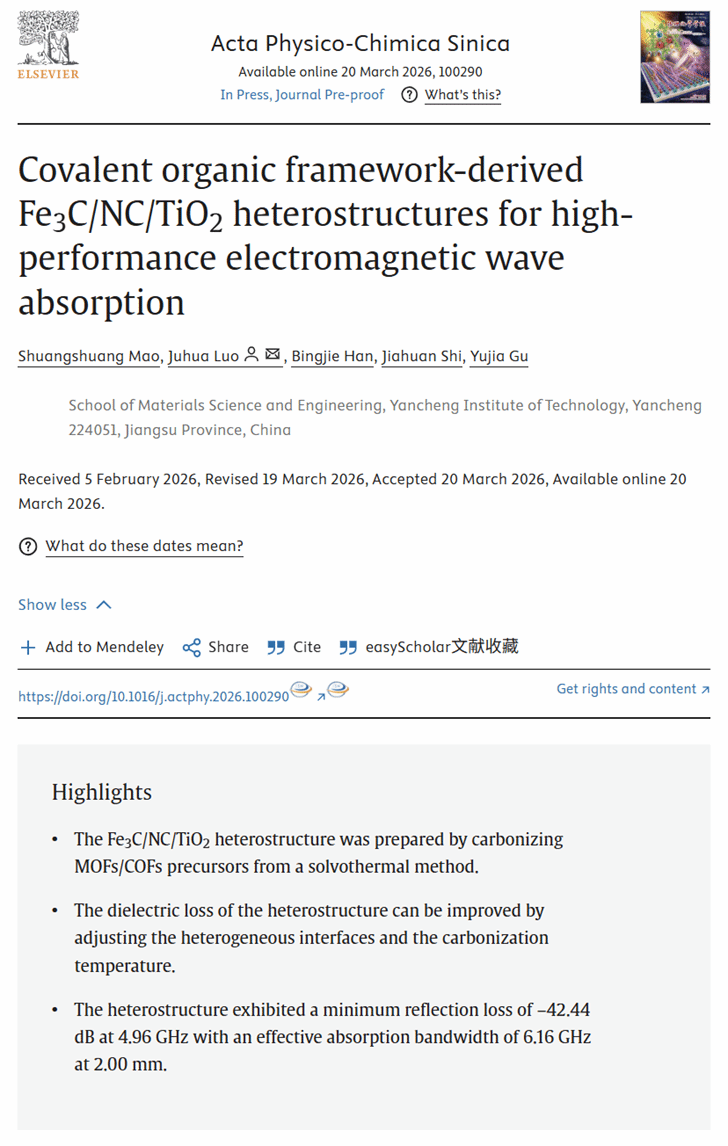 近日,材料学院研究生毛双双在罗驹华教授的指导下,在《Acta Physico-Chimica Sinica》(2026: 100290)上以第一作者身份,盐城工学院为第一单位发表了题为“Covalent organic framework-derived Fe3C/NC/TiO2 heterostructures for high-performance electromagnetic wave absorption”的研究论文,文章链接:https://doi.org/10.1016/j.actphy.2026.100290。该期刊为SCI一区TOP期刊,影响因子:13.7,该论文是我院研究生高质量培养的又一次重要体现。