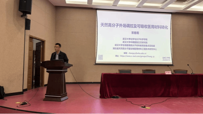 常春雨教授以《天然高分子外场调控及可吸收医用材料转化》为题,围绕天然高分子在外场作用下的结构调控机制,系统介绍了天然多糖、丝素蛋白等天然高分子领域的研究进展,重点阐述了团队在人工肌肉、软驱动器、传感器等智能材料方向的研究成果。同时,常教授分享了相关成果在骨修复材料、医用敷料等生物医学领域的转化应用探索。报告中,他结合课题组基础研究与产学研合作实践,围绕高端医疗器械国家重大需求,深入介绍了科研成果从实验室研究走向产品注册与临床转化的实践历程与思考。