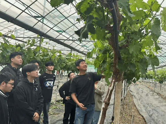 在农场导师潘志鹏指导下,学生们系统了解巨峰葡萄的发展历史和生长周期。实践环节中,潘志鹏演示“三剪定形法”:左手轻托二年生藤蔓,右手精准剪除卷曲须根。“弯须会争夺主枝养分,就像人生要定期修剪杂念。”