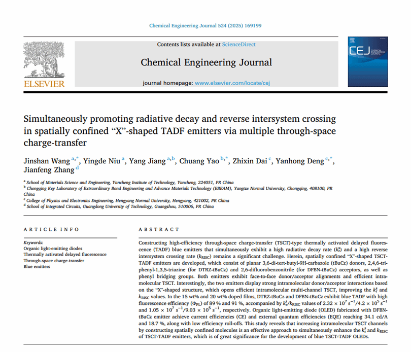 近日,材料学院王金山教授在高水平期刊《Chemical Engineering Journal》(中科院一区TOP,影响因子13.2)上发表题为“Simultaneously promoting radiative decay and reverse intersystem crossing in spatially confined X-shaped TADF emitters via multiple through-space charge-transfer”的研究论文(Chemical Engineering Journal, 524 (2025) 169199, DOI:10.1016/j.cej.2025.169199),盐城工学院为第一单位,王金山教授为第一/通讯作者。