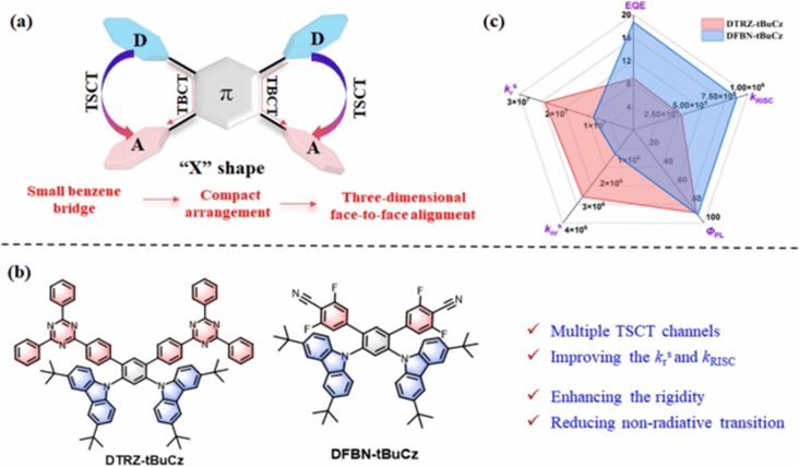 当前,开发兼具高辐射衰减速率与快速反向系间窜越速率的空间电荷转移(TSCT)热活化延迟荧光(TADF)材料仍具挑战,制约了蓝色OLED的器件效率与稳定性。此外,分子构型精确调控困难、可供选择的连接单元有限、以及光谱偏宽导致的色纯度不足,共同制约着蓝色OLED材料在显示应用的突破。