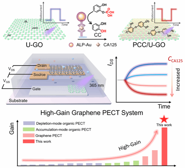 石墨烯光电化学晶体管(Graphene Photoelectrochemical Transistor, GPECT)作为一项新兴技术,融合了光电化学生物传感的高信噪比、高灵敏度特性,以及晶体管本征的信号放大能力,能够实现光-电-生物识别事件的相互关联。基于前期研究工作基础(Advanced Functional Materials 2025, 35: 2500235;Chinese Chemical Letters 2025, 36: 110080;Biosensors and Bioelectronics 2025, 268: 116877;Journal of Analysis and Testing JAT-2025-0647 accepted on Nov 14, 2025),王成双和王伟教授联合南京大学赵伟伟教授设计并开发了一种同时实现信号翻转和超高增益的GPECT生物传感平台,具体而言,主要利用聚邻苯二酚/紫外还原氧化石墨烯(PCC/U-GO)光敏栅极对GPECT器件进行高效调控,并应用于糖类抗原125(CA125)的高灵敏检测,通过采用标记碱性磷酸酶的夹心免疫法,催化生成邻苯二酚(CC)在U-GO栅极表面原位聚合形成PCC,沟道电流呈现阳极到阴极的信号翻转,器件实现了高达1.7 × 10⁵的超高增益,同时对生物标志物CA125的检测限低至0.004 mU mL−1。该工作将有力推动新型栅极材料在生物电子学和光电子学领域的广泛研究与应用。