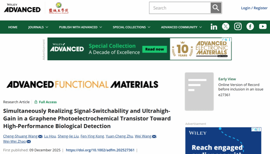 近日,材料学院王成双和王伟教授联合南京大学赵伟伟教授在材料领域国际顶级期刊《Advanced Functional Materials》(中科院一区Top,影响因子19)上发表题为“Simultaneously Realizing Signal-Switchability and Ultrahigh-Gain in a Graphene Photoelectrochemical Transistor Toward High-Performance Biological Detection”的研究论文(DOI: 10.1002/adfm.202527361),盐城工学院为第一署名单位,第一/通讯作者王成双教授指导硕士研究生完成实验设计、结果分析及论文撰写,通讯作者王伟教授负责研究方案指导、结果分析和论文润色,通讯作者南京大学赵伟伟教授负责晶体管制备、实际样品检测及论文润色。本研究得到了盐城工学院和江苏省高校“青蓝工程”中青年学术带头人等项目经费的支持。