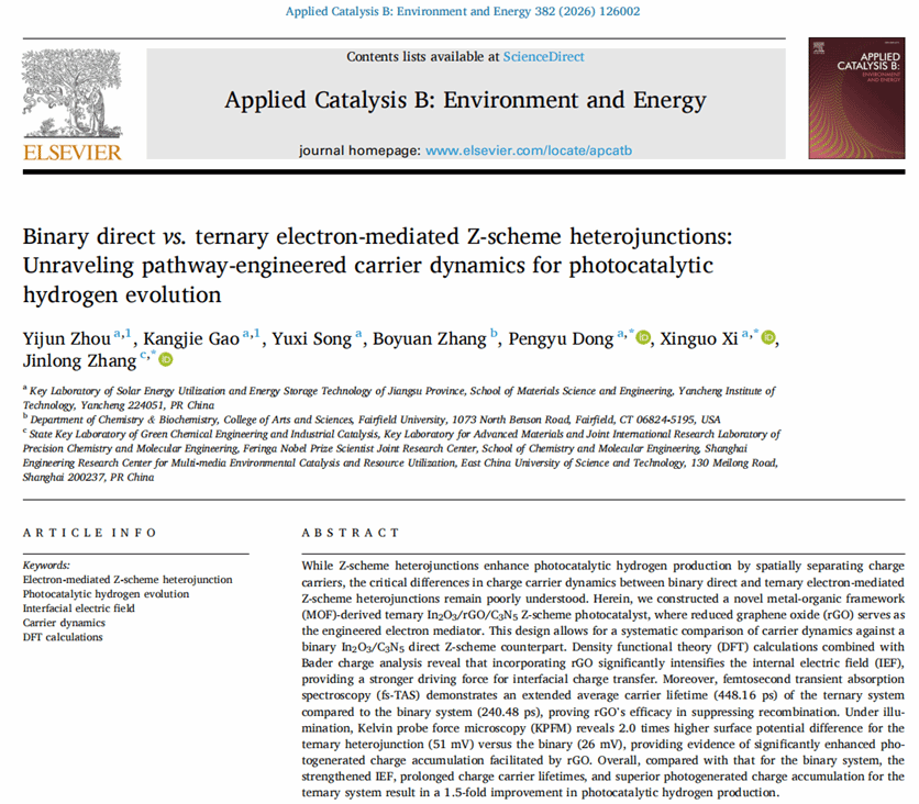 近日,材料学院研究生周怡君在奚新国教授、董鹏玉教授与华东理工大学张金龙教授的共同指导下,在《Applied Catalysis B: Environment and Energy》(382 (2026) 126002)上以第一作者身份,盐城工学院为第一单位发表了题为“Binary direct vs. ternary electron-mediated Z-scheme heterojunctions: Unraveling pathway-engineered carrier dynamics for photocatalytic hydrogen evolution”的研究论文,文章链接:https://doi.org/10.1016/j.apcatb.2025.126002。该期刊为SCI一区TOP期刊,影响因子:21.1,该论文是我院研究生高质量培养的又一次重要体现。