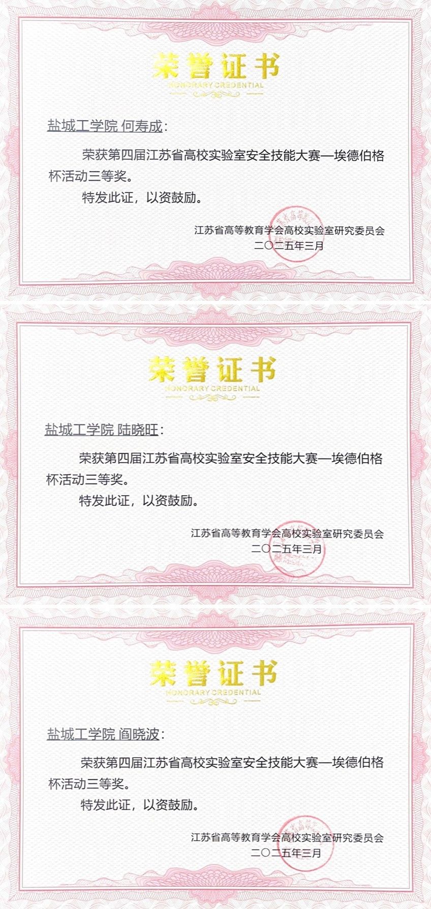 3月22日,由江苏省高校实验室研究会主办的第四届江苏省高校实验室安全技能大赛在常州大学科教城校区举行。我院何寿成、陆晓旺、阎晓波3位老师组成的参赛队伍荣获三等奖。